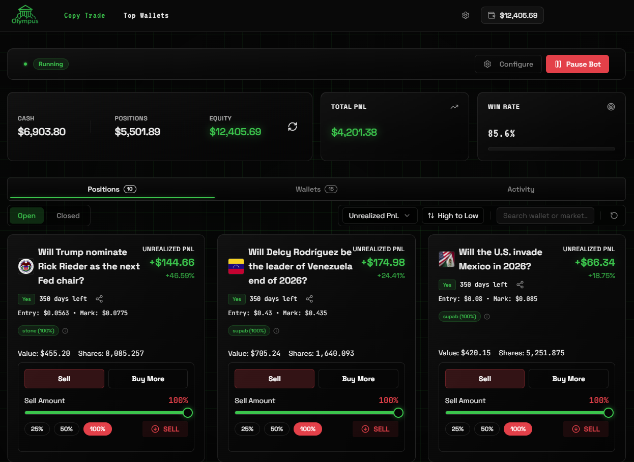 Olympus gives you a web terminal to trade on Polymarket: manually buy any market you want, browse positions, and manage your portfolio β all in one place. You can also view trader profiles to see performance, PnL history, and positions of top wallets before you decide to follow them.